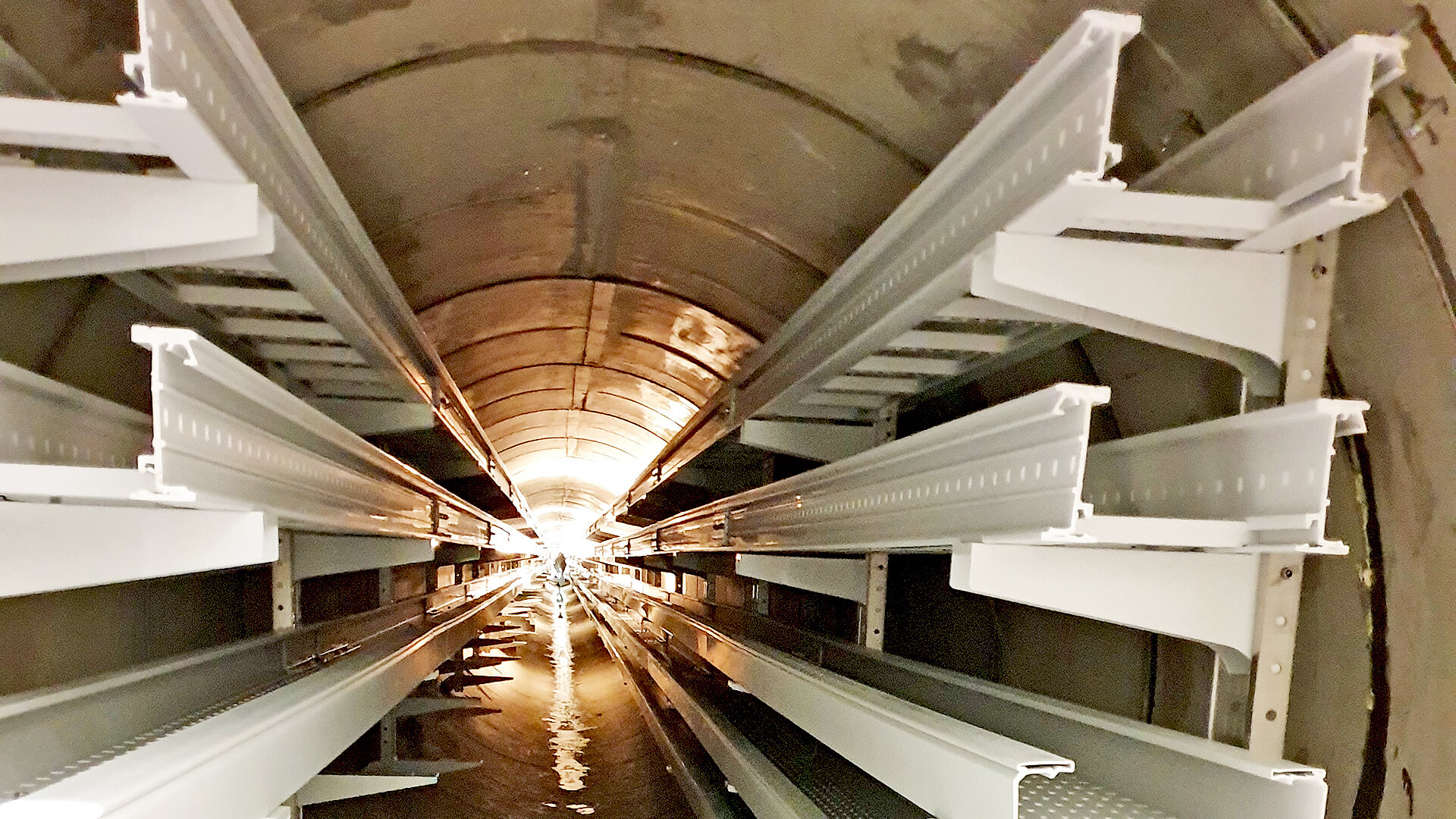 DriveCon war mit der Planung der technischen Ausrüstung des Dükers beauftragt. Konkret sind waren für das Kabeltragsysteme und die Trassenplanung verantwortlich. Das heißt, wir haben festgelegt, welches Kabel wo im Düker geführt werden muss, damit am Ende kein Kabelsalat entsteht, sondern alle Kabel ordentlich verlegt und deren Biegeradien eingehalten werden. Nachdem alle Kabel eingebracht waren, blieb in der Mitte lediglich ein Gang von 0,7 Meter übrig. Darüber hinaus haben wir die Beleuchtung geplant und eine Beleuchtungsberechnung durchgeführt, sodass die geforderte Mindestbeleuchtungsstärke erreicht wird. Zusätzlich wurden Not- und Sicherheitsleuchten eingeplant, die im Fall eines Stromausfalls auf die Ausgänge hinweisen.