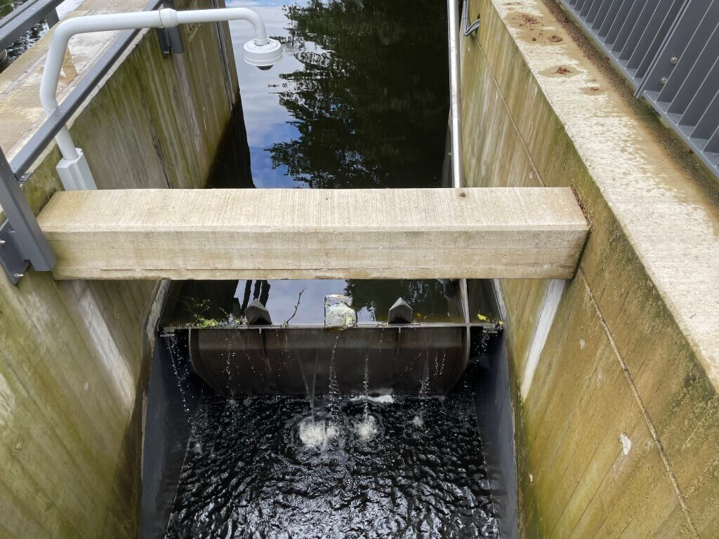 Parallel to this main weir, a bypass channel runs along the eastern side, separated from the lock pond by a stoplog weir (secondary weir). This secondary weir is normally closed and only opened to drain water from the pond during maintenance.